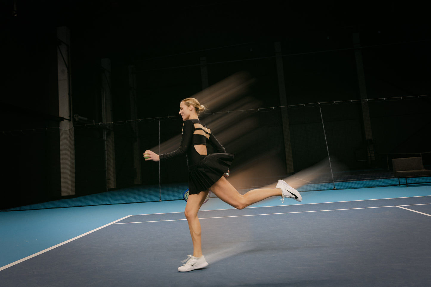 A sleek black court-inspired dress designed for confident movement on and off the tennis or padel court. It features long sleeves, a subtle nude-toned net detail for refined contrast, and an open back that shapes a feminine, elongated silhouette. Comes with black shorts.