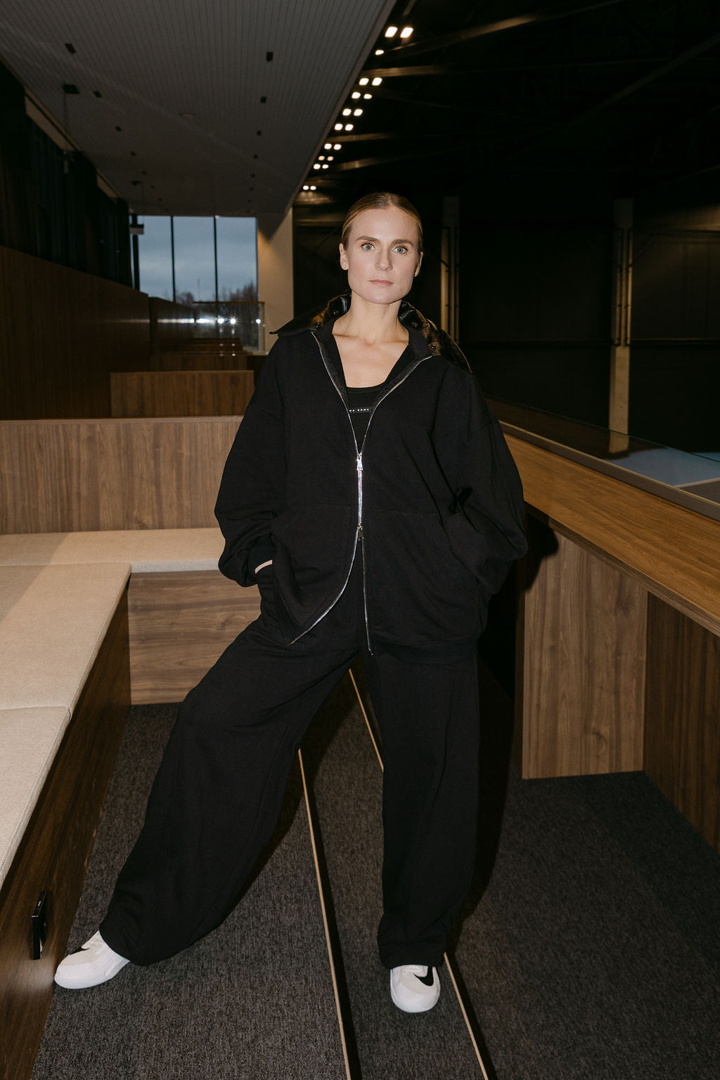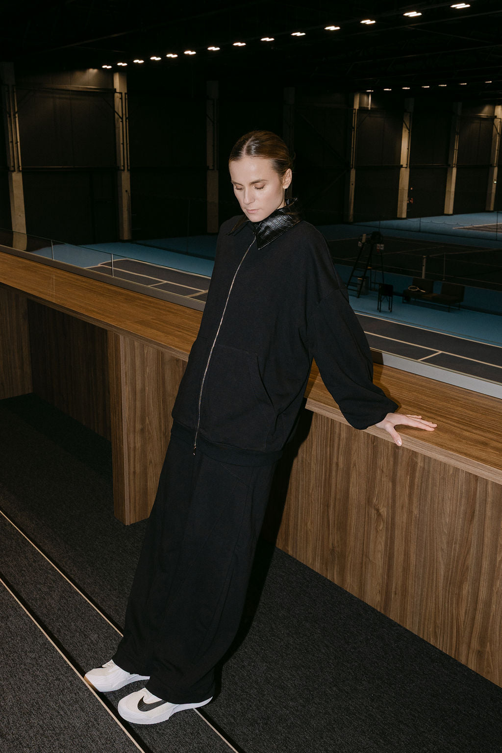 The zip-up hoodie features a faux leather snake-effect collar, adding a sharp detail to a relaxed shape. The high-waisted balloon wide-leg trousers create a flattering, elongated line.